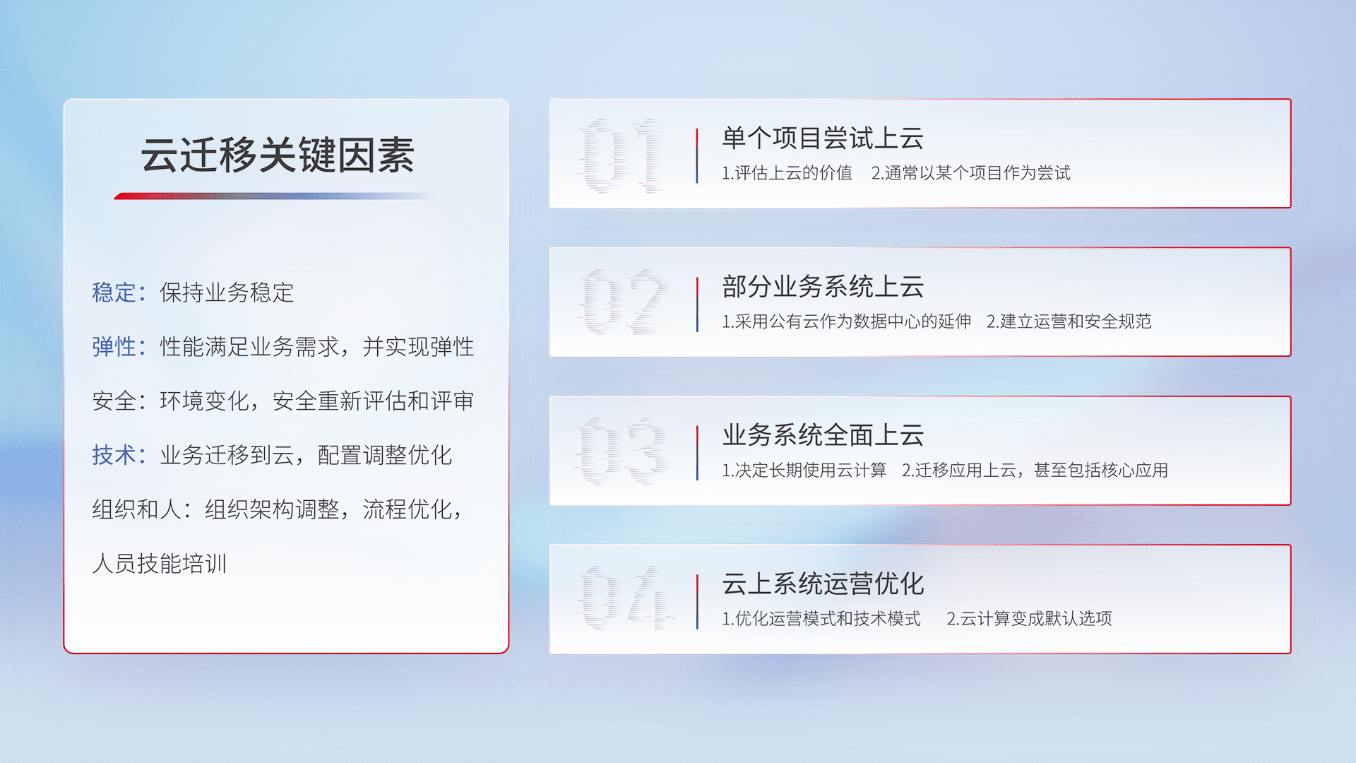 结合实际业务,,,从规划设计、、、、云平台选型、、、云原生改造、、、数据迁移、、集成交付,,,,迁移全过程为客户识别最佳上云路径,,,,做好风险识别管理,,,,设计网络架构、、身份权限、、、、安全审计合规、、、、操作审计、、、、日志审计、、、监控告警策略、、、多站点容灾设计等,,对云上基础设施进行整体规划,,,提升IT治理水平,,,,以满足弹性、、高可用、、高性能的需求。。。